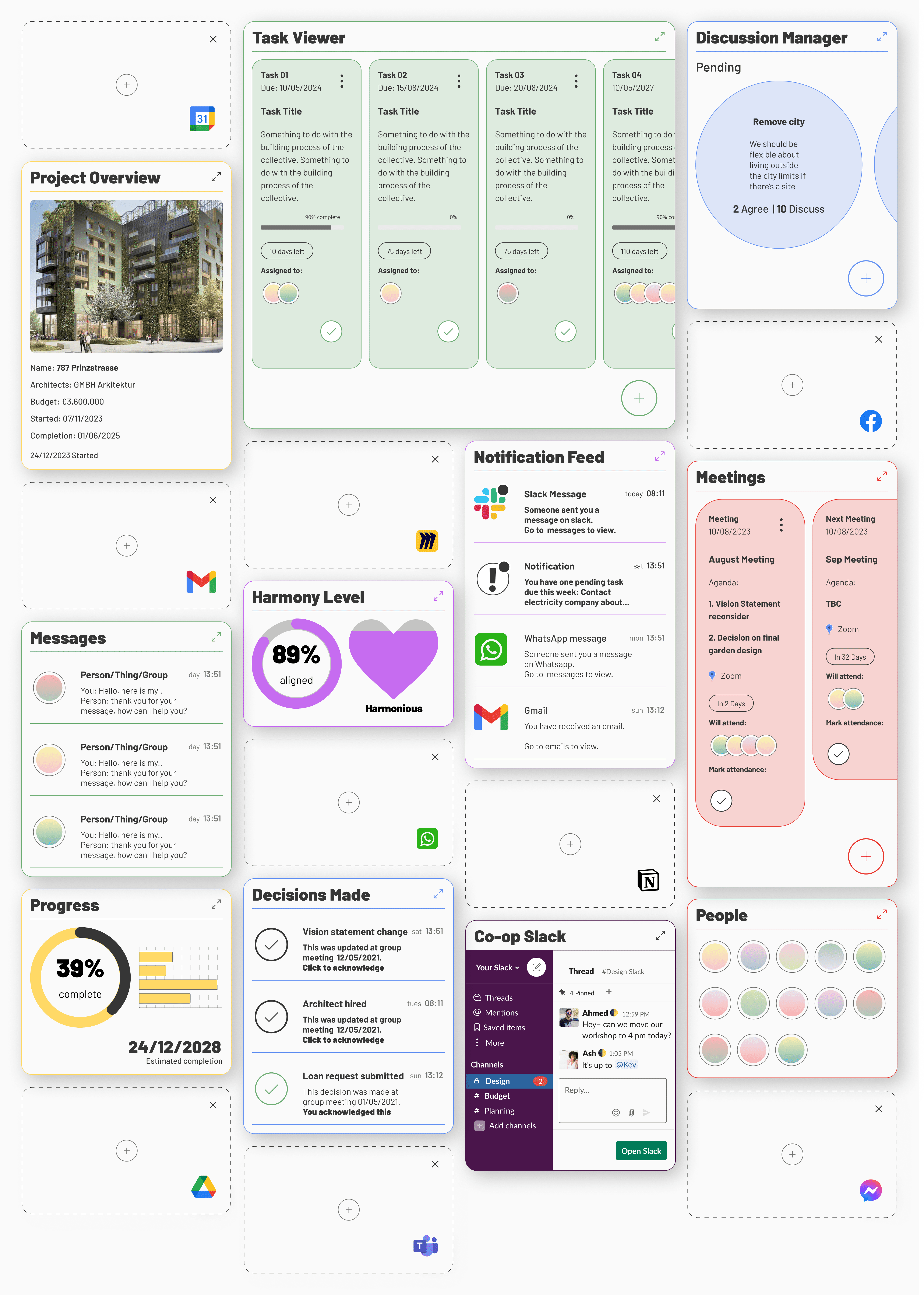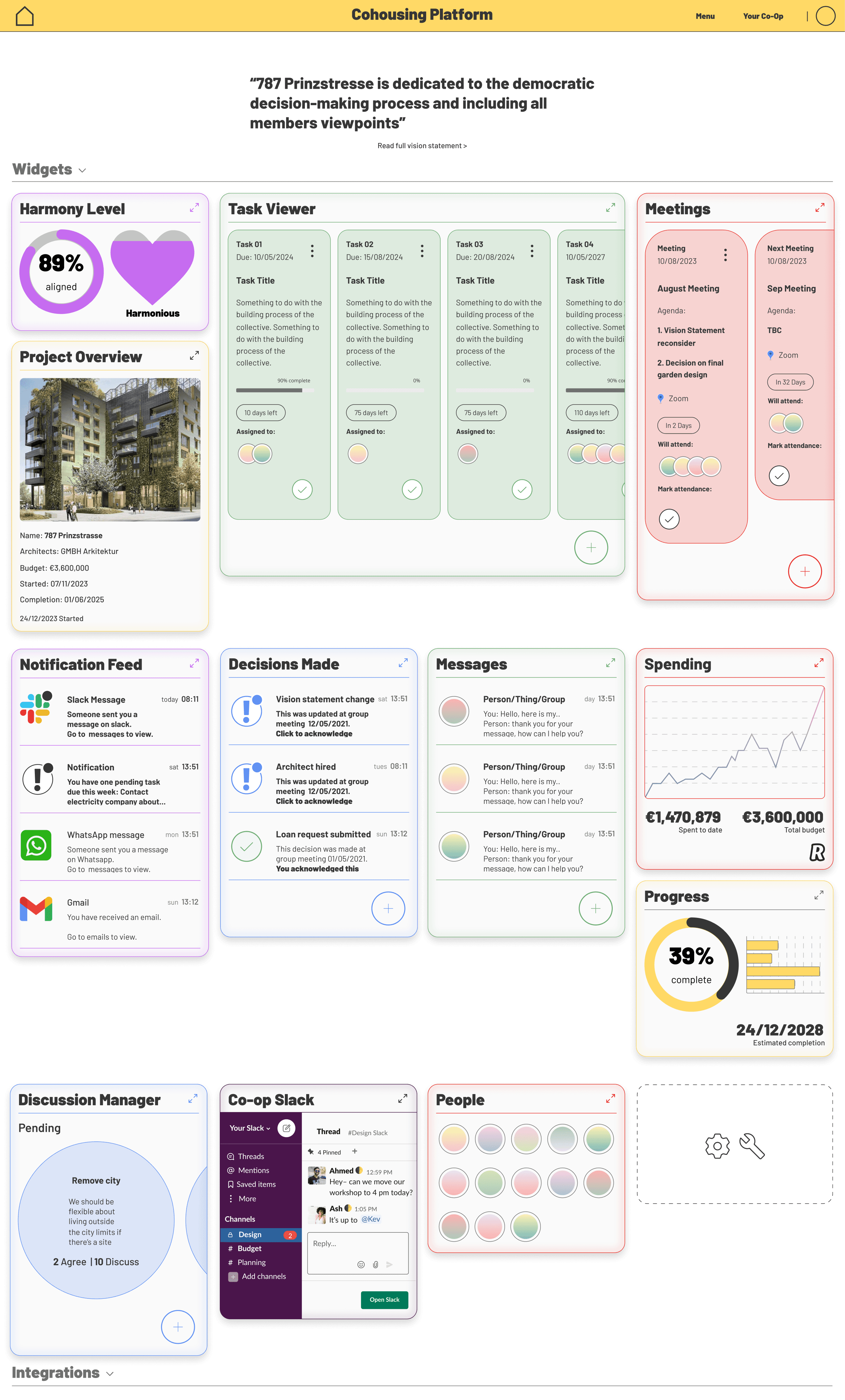 To make use of slack more accessible, it is synthesised into the general messages and notification feed provided by the cohousing platform. Providing this here eliminates the need for using multiple different communication tools as they can be accessed and interacted with in the platform.