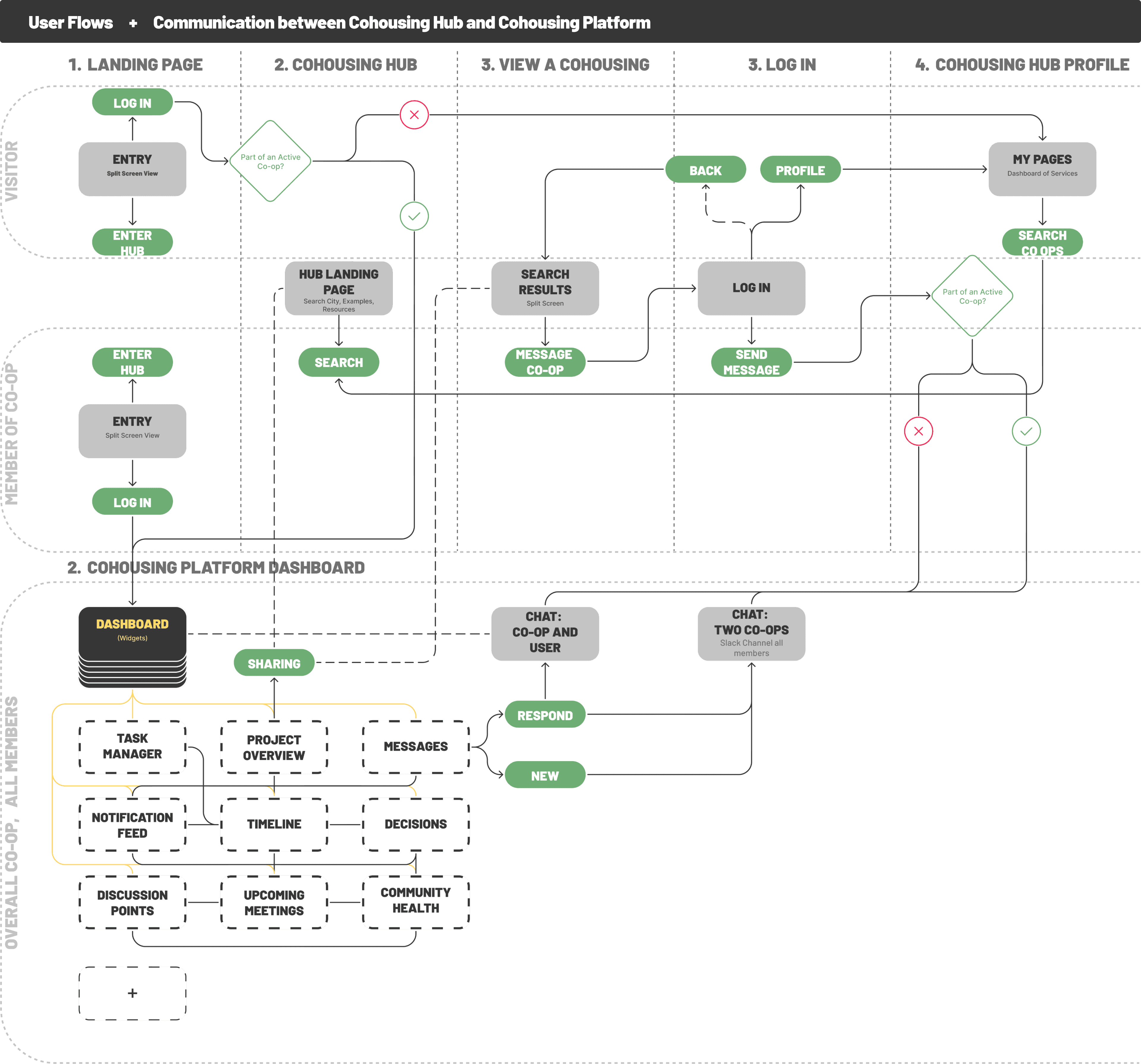 Each aspect of the service depends on the other. The below user flow diagram shows how certain tasks, such as a chat between an individual user and a cohousing group, depends on actors in each side.