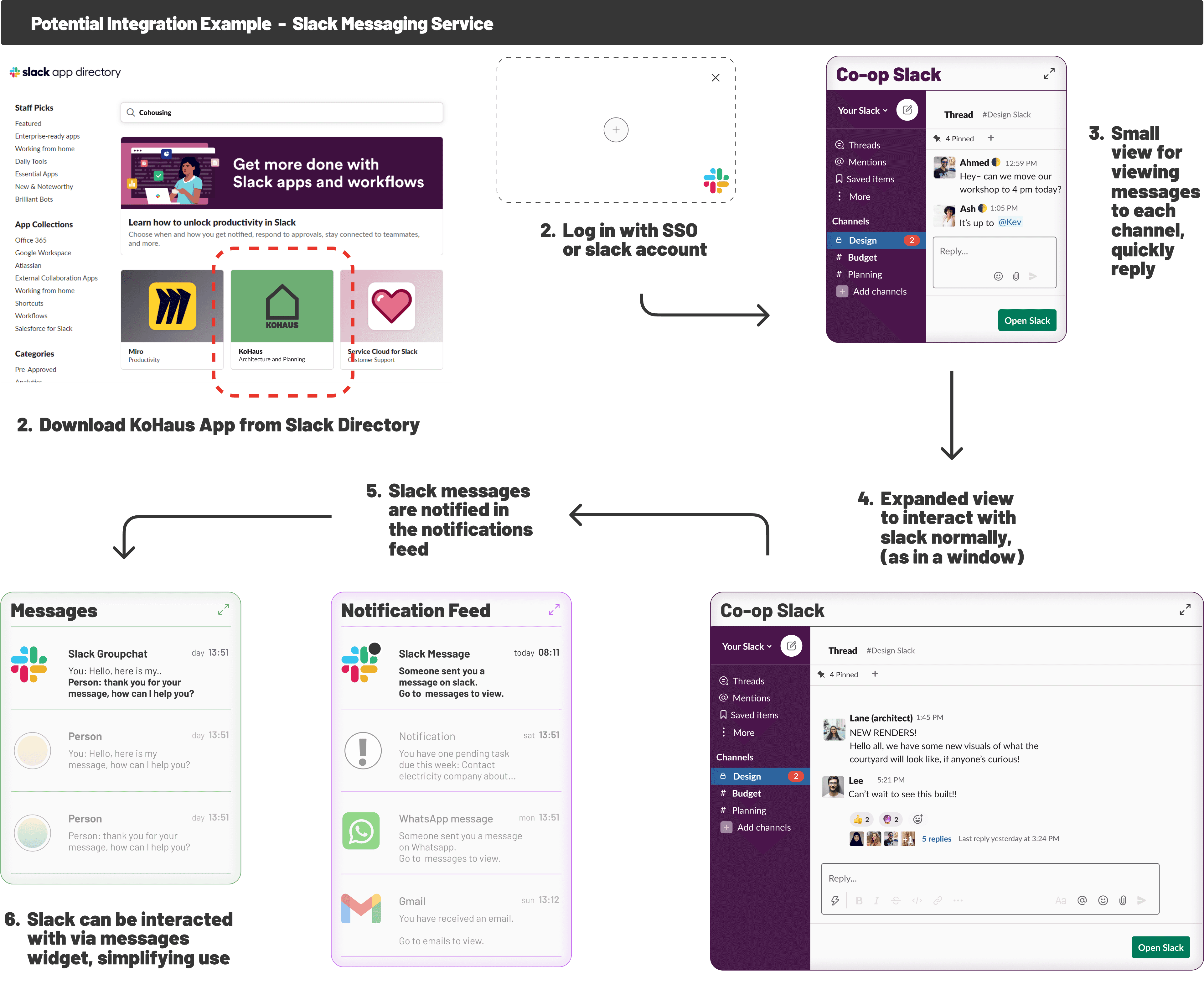 The below diagram demonstrates how integration would work in the case of the Cohousing group using Slack as a messaging service.