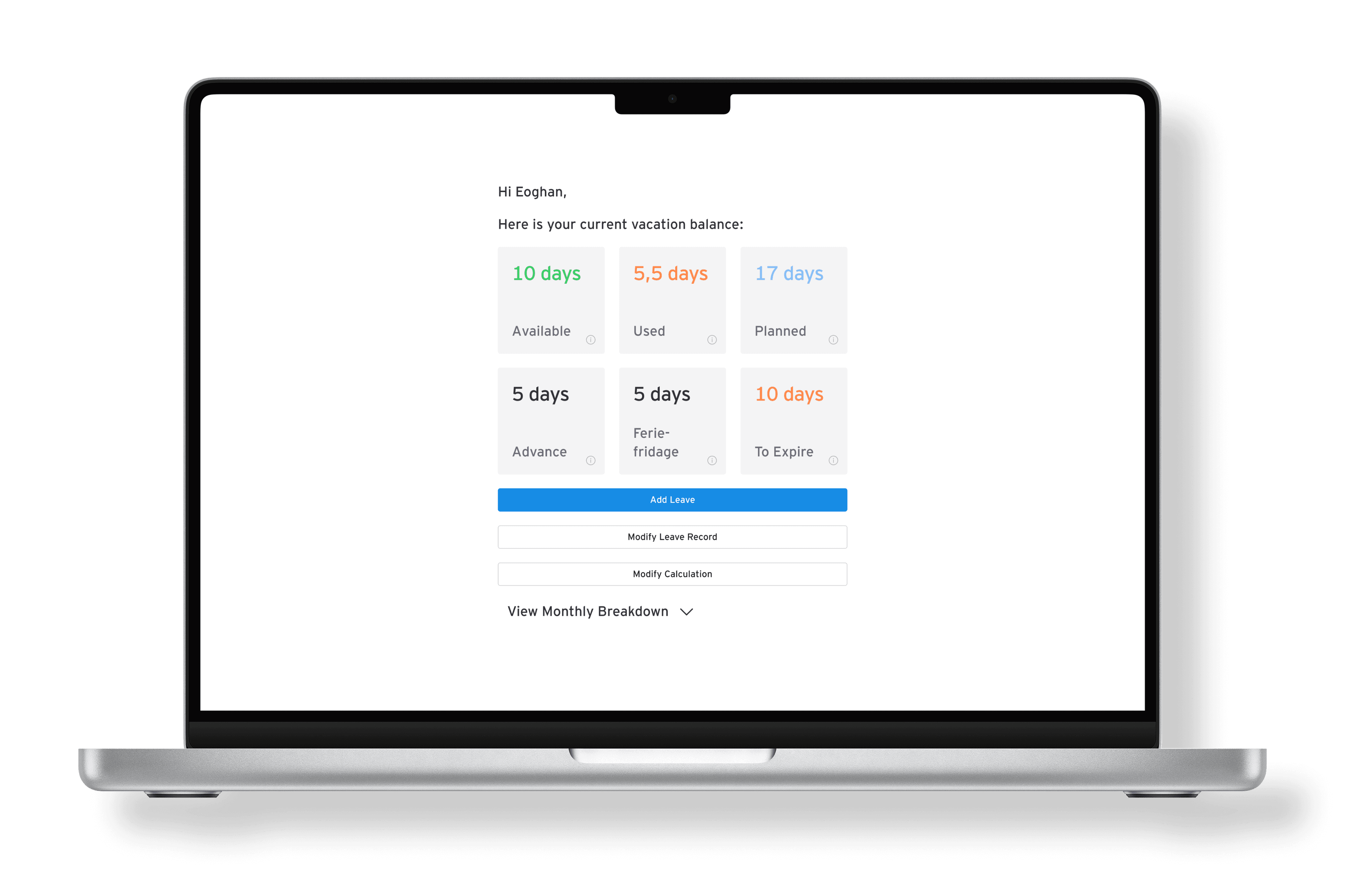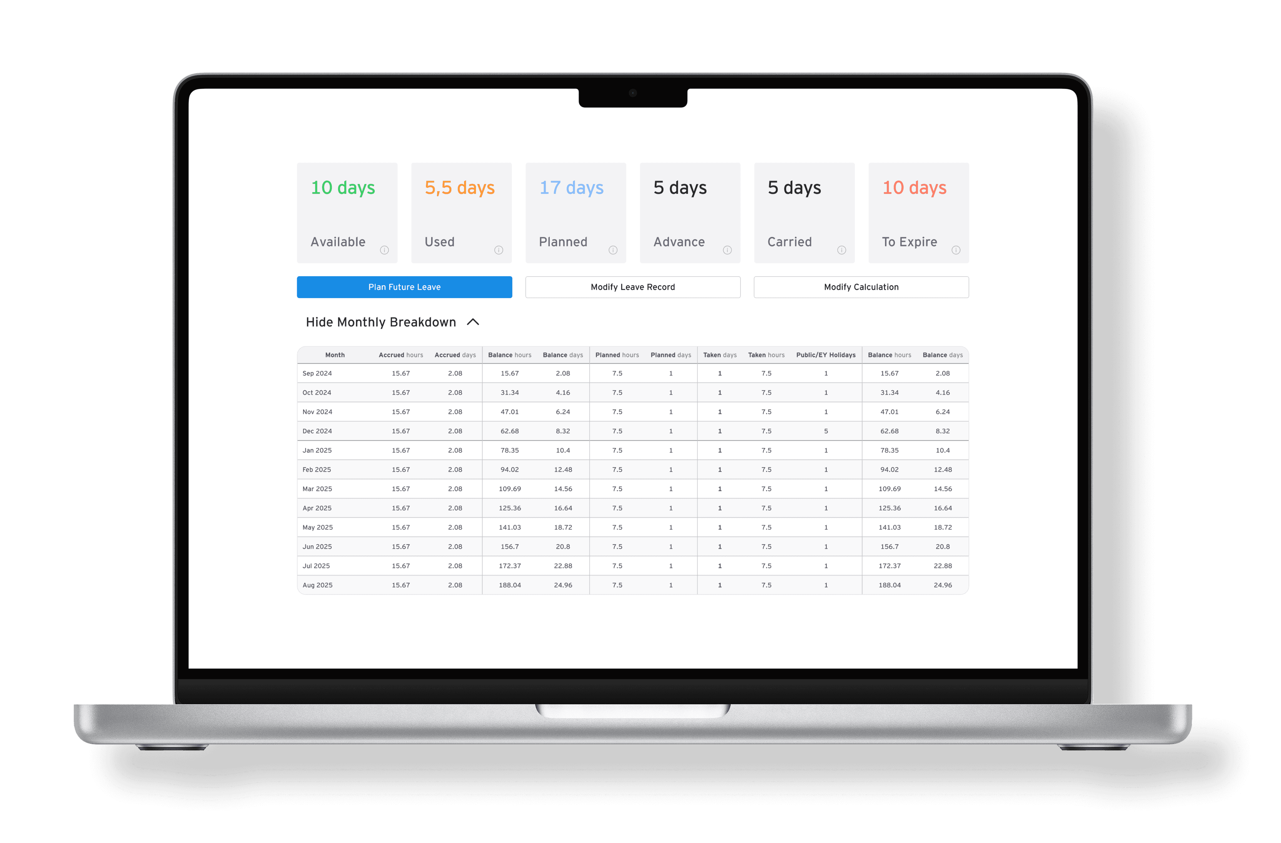 Offering a monthly breakdown of the whole vacation year, it lets users know how much time off they will have at any given point in the future